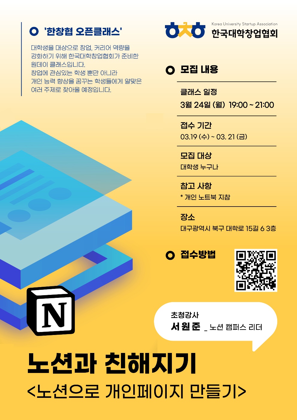 서원준 Notion 캠퍼스 리더와 함께 올인원 협업 플랫폼 'Notion' 활용법을 배우는 클래스 입니다.